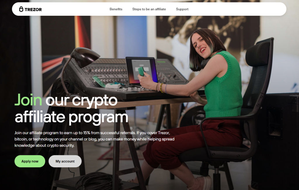 Trezor is another trusted hardware wallet brand, often preferred by privacy focused users. Commissions range from 12 to 15 percent, slightly higher than Ledger. This program works well with comparison content and long form reviews. Users who care about self custody tend to convert strongly. It pairs well with educational content.
